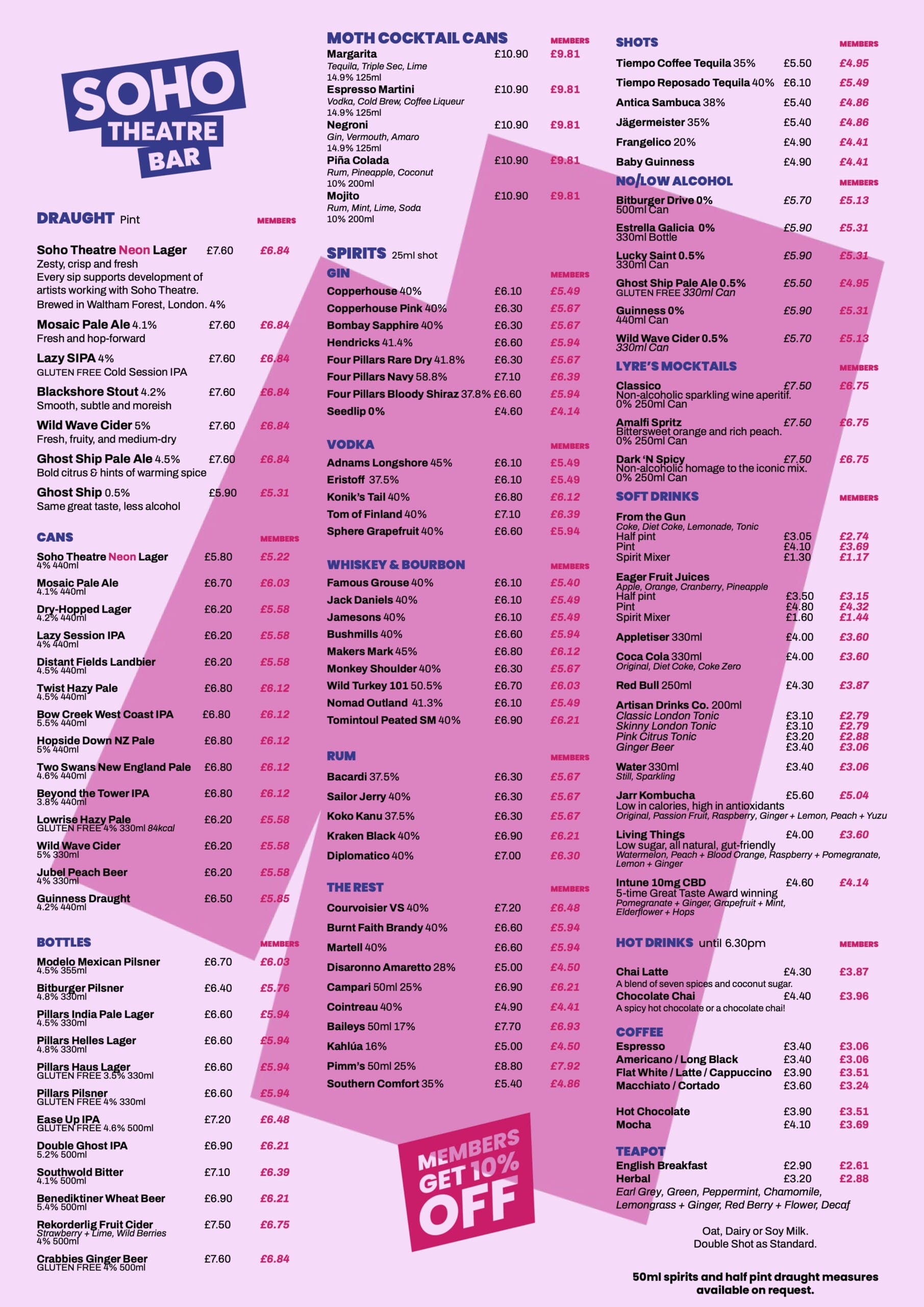 Whether you’re after a cuppa or cocktail, lemonade or lager, gin & tonic or ginger beer, we’ve a great range of standard, gluten-free, vegan, alcohol-free and low-alcoholic drinks available. We’ve also got delicious a delicious food offering available all day and into the evening. And while you don’t have to be a member to get in, Soho Theatre Members get late(r) entry and 10% off all food and drinks.